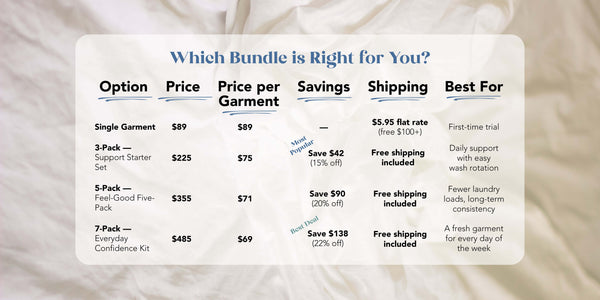 The 3-Pack is a great starting point—especially if you're new to pelvic support garments or between sizes. It gives you enough to rotate through a few days while saving on price per pair.